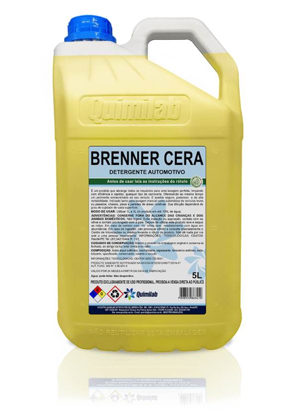 Detergente automotivo com cera, neutro, super concentrado e de coloração amarelada. Limpa e desengordura a pintura, realçando a superfície do veículo, deixando um brilho especial e protegendo contra os raios solares.